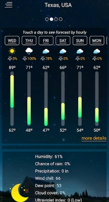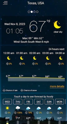 The weather forecast app displays some easy-to-understand charts, the interface is suitable for quick viewing. Download and enjoin it. If you like, please share it with your friends. If you have any questions or suggestions, please get in touch at whetherfeedback@gmail.com