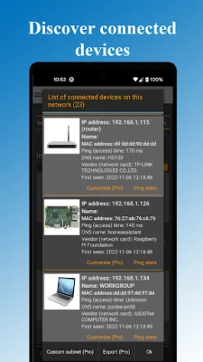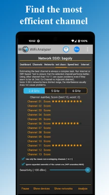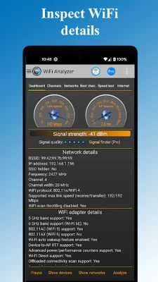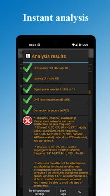 - Supports WiFi 5GHz - Supports WiFi 2.4GHz - Displays channel width by default - Best channels for connected AP - View information about your connection - Detect who is connected to your WiFi - WiFi Speed Test - Analyze signal strength and latency (ping) - Open router settings - Best channel recommendation - Export result
