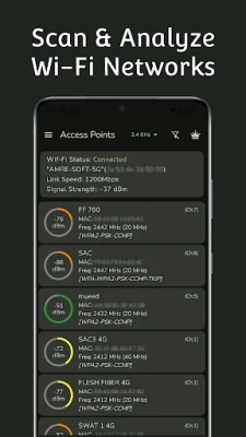 - WiFi Scanner: Discover nearby networks, connected devices, and signal strength in real-time.
