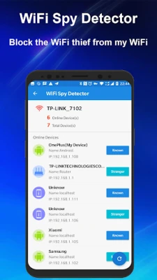 Easily scan my WiFi and see how many devices connected to your WiFi network. You can mark as 'Known' or 'Stranger' or block them from your WiFi Router.