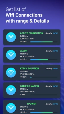 - Know your signal strength of your connected Wi-Fi. - Details of Wi-Fi connection like MAC address, SSID, BSSID, RSSID, Ip address etc. - Get full details of available nearby Wi-Fi networks. - Check connected Wi-Fi network speed and performance. - Save speed test history and data.