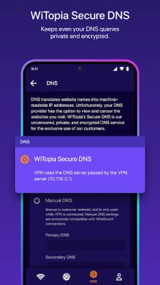 Uses our own secure DNS servers to cloak your DNS queries