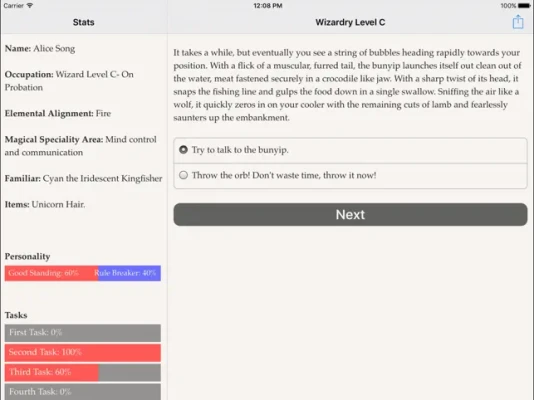 • Choose your name, gender, elemental alignment and area of magical focus. • Explore worlds both on and off Earth, full of magical creatures. • Track your standing with the wizardry guild and your success in completing the tasks they set. • Good replayablity with branching story lines and over 19 different endings. • Hints section. • Save points allowing replay some sections without having to restart the story from the beginning. • And well....who wouldn't want to be a wizard?