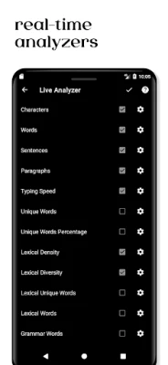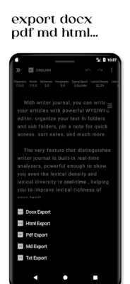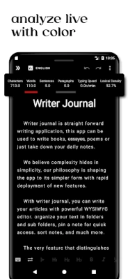 Well, unlike many similar journal apps in the market, it has the most powerful built-in real-time text analyzers, calculating the most important information for your text helping you enrich your writing skills in terms of lexical richness, content structure, etc.