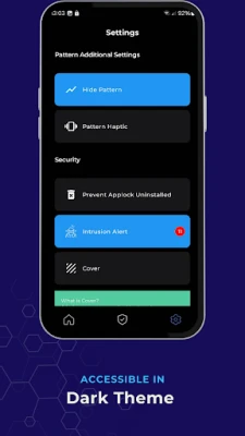 Vibration, Line visibility, Rearrange PIN Key, Prevent AppLock Uninstalled, Search Apps, Quick Unlock, Dark Mode Support and No Ads.