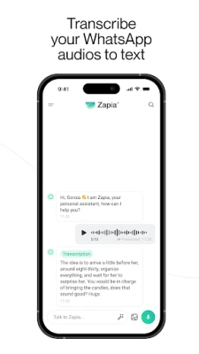 Zapia is your Personal AI Assistant, available 24/7 to make your daily life easier. Use it to contact businesses on your behalf, schedule messages, set reminders, transcribe audio, summarize news, find products and services, interpret photos, generate content, and more.